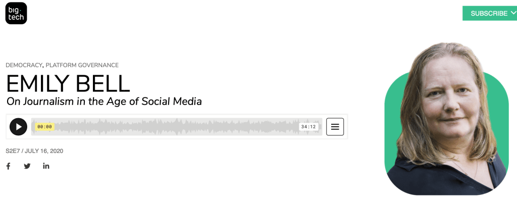 When listening to Emily Bell on the “Big Tech” Podcast, it required me to take a step back, and look at the role journalism has in today’s society. Journalism is extremely important to society for multiple reasons. For starters, journalism keeps our politicians in check, and holds them accountable. Without honest, and unbiased Journalism, the people in charge of running our great nation could potentially abuse our countries democratic values. Journalism also functions as a way to inform the public of the problems the world faces, and how we can fix them. It informs the people on many facets of daily life, whether it’s sports, politics, finance, or even pop culture, journalism is designed to function as the main way we as a nation stay informed.